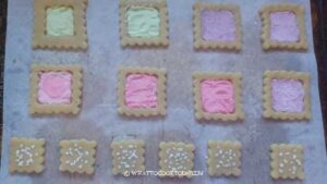 My son had fun cutting out the center pieces to fill up the crushed up candies. We don’t have matching big and small cutters, but he just creatively used different cutters to do it. This batch right here was done by him 🙂