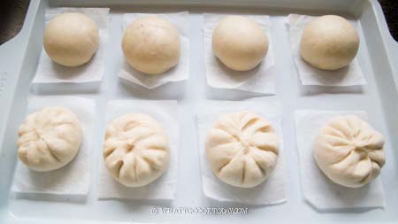8. Let the dough rise at room temperature or at a warm place. If it’s winter where you are, you can use your oven “bread proof” function to let them proof in there, or simply turn on your oven to the lowest temperature and then turn off and after 15 minutes, place the shaped buns in there to let them proof. They won’t necessarily double in size, but at least puff up to about 50% of the original size. This may take about 1 hour or longer at a warm temperature. Don’t go by the time however. Observe the dough instead! Use a finger test too. When you gently push on the dough, it will leave an indentation but it will spring back slowly. This dough is perfectly proofed.