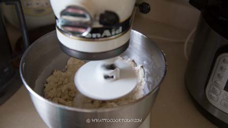 - Attach the dough hook to the stand mixer. Turn on the mixer at the lowest speed to prevent the flour from flying all over the place. Knead at low speed (speed 2 on KA) for 3-4 minutes or until the dough roughly come together. If the dough feels dry, add milk, one teaspoon at a time. The dough needs to feel soft. You can increase the speed to speed 4 and knead until the dough clears the side of the bowl, feel smooth and soft, about 3-4 minutes (depending on your machine too).