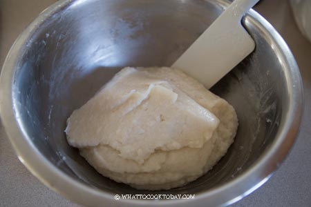 - Remove from the food processor into a large bowl. Add tapioca starch and all-purpose flour. Knead into a dough that is just slightly sticky to touch, but it shouldn't be too sticky. If it is sticky, add just a bit more all-purpose flour but not too much