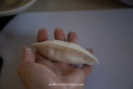 You can shape pempek into whatever shapes you want. You can shape it into a log to be pempek lenjer, shape it like a disc (pempek gepeng), pempek kapal selam (usually with egg filling inside). I recommend oil your palms during shaping instead of dusting with more flour. The more flour you use, the tougher the pempek going to be