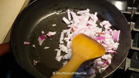 - Melt 1 Tbsp of coconut oil. Add onion and stir fry until they are soft and slightly caramelized, about 3-4 minutes. Remove from the pan and set aside to cool down
