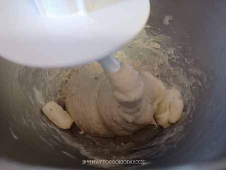 2. Use a dough hook attachment to knead the dough on speed 2 until all the crumbly dough starts to come together into one mass, it may take about 2-3 minutes for this to happen. Don’t be tempted to add any liquid. You may need to stop halfway and scrape the dough off the hook and the sides of the bowl and knead again for another 3 minutes. Gradually add in the softened butter bit by bit.  The dough will turn into a sticky mess again because of the butter.