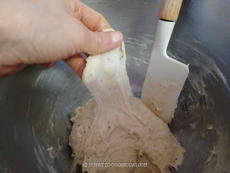 - Gradually add in the softened butter bit by bit. The dough will turn into a sticky mess again because of the butter. Just keep kneading and stop halfway and scrape the dough off the hook and bowl again and continue to knead until the butter is absorbed by the dough. IT WILL HAPPEN, don't worry! DO NOT be tempted to add any extra flour. You will get a shiny smooth dough that is very elastic. This may take about 5-8 minutes on speed 4, depending on your mixer too. The dough must pass a windowpane test, meaning, when you stretch a small amount of dough thinly, it won't break and a light can pass through