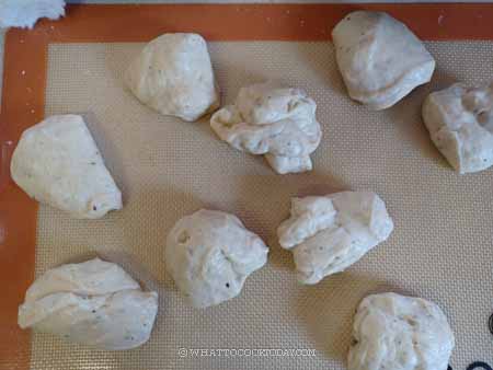 - Line a large baking pan with parchment paper. Degas the dough by punching it down and then divide into 10 buns, roughly the same size or weight. Keep them covered and rest for 5 minutes to relax the gluten