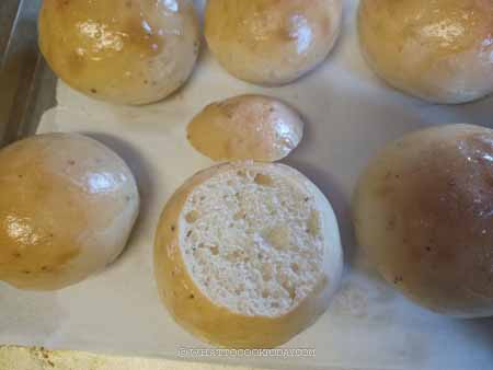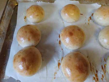 11. Place the pan on the middle rack and bake for 10-12 minutes or until golden brown or the inner temperature in the center is 190 F. Do not overbake as it will dry out the crumbs and the bread won’t stay soft the next day. I highly recommend a digital thermometer if you bake often as it helps to clear out that doubt whether the bread is baked through or not. Remove from the oven and let them cool down on cooling rack completely before assembling