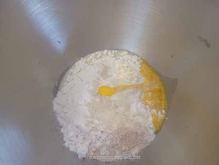 - Mix all the dry ingredients together in a mixing bowl. Make a well in the center and pour in the wet ingredients. Use a dough hook attachment to knead the dough on speed 2 until all the crumbly dough starts to come together into one mass, it may take about 2-3 minutes for this to happen. Don't be tempted to add any liquid. You may need to stop halfway and scrape the dough off the hook and the sides of the bowl and knead again for another 3 minutes