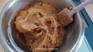 - When the dry and the wet is almost combined, add the chocolate chips and continue to fold until you don't see any dry pockets of dry ingredients. Take care not to overmix though. This is a very thick batter
