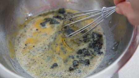 - In a mixing bowl, whisk egg yolks, with oil, milk and then add the black sesame paste and keep whisking until the paste is combined with the others. Sift in flour and salt. Whisk to combine and set aside