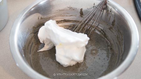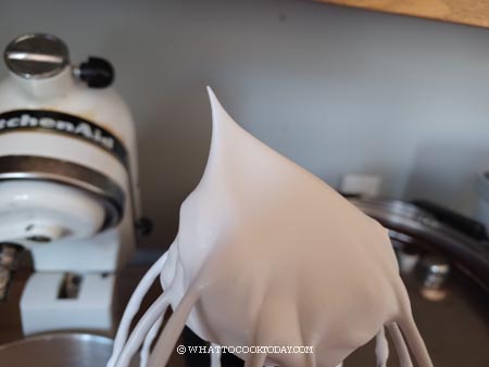 6. Place the egg whites in a clean bowl. You will have trouble whipping your meringue if there’s a trace of grease in your utensils or bowls. Beat the egg whites on medium speed (speed 6 on KA) until it’s foamy, add in the cream of tartar or lemon juice and gradually add in the sugar as you beat, 1/3 at a time and wait for about 1 minute before adding the next. Keep the speed on medium (speed 6) and beat until the meringue has a stiff peak with a slight bent on the tip. Then lower the speed to speed 4 and beat for one minute to even out large bubbles