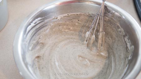 4. I suggest separating the yolks and whites a bit earlier (about 30 mins or so)so that the egg whites have time to come to room temperature. It whips better at room temperature. In a mixing bowl, whisk egg yolks, with oil, milk and then add the black sesame paste and keep whisking until the paste is combined with the others.