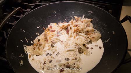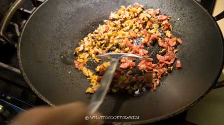 - Add the shredded daikon and stir fry until it softens and a bit dry. Add the sausage mixture back followed by the seasonings. Stir to combine everything