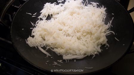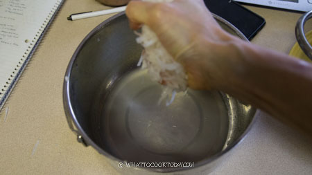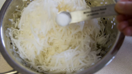 - Grate daikon and toss with 1/3 tsp of salt and let it sit for 10 minutes. Squeeze out the liquid.
