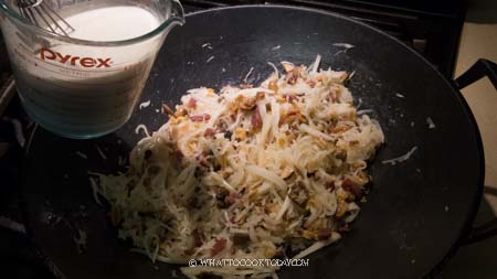6. Give the batter a stir to combine and pour over the daikon mixture and stir fry over low heat