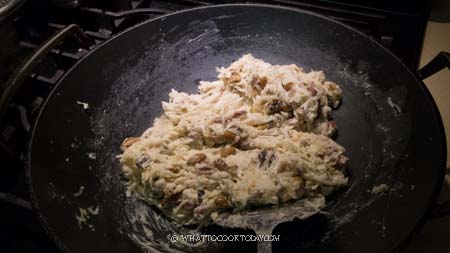 - Give the batter a stir to combine and pour over the daikon mixture and stir fry over low heat. The mixture will start to get thicken. Off the heat