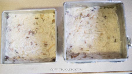 8. You can use an 8 x 8 inch pan or 9 x 9 inch pan. You can also use two 4 x 4 or 5 x 5 inch pan. Oil the pan on all sides or line the bottom of the pan with parchment paper for easier release later. You need a 7 inch round pan if you use 6 quart-instant pot (the cake will be taller). Spread the mixture into the pan as evenly as possible. Cover with aluminum foil