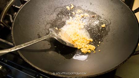 3. Preheat wok/skillet. Add in cooking oil. Saute shallots for about 2 minutes. Add the dried shrimp and saute for another minute