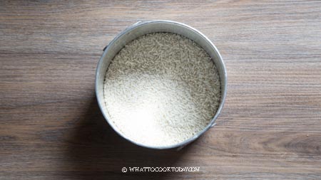 There’s no need to soak the rice if you use a pressure cooker. Simply put the rice with water in a pan, preferably something that conducts heat well like aluminum or stainless steel.