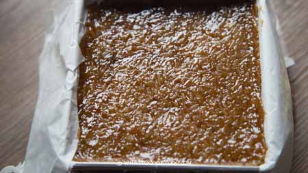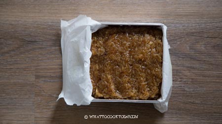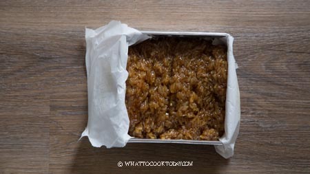 - Pour this sticky gooey rice mixture into the lined pan and spread it evenly as much as you can using a rubber spatula. Use another piece of parchment paper to cover the top and use your palm to press the sticky rice down. Make sure to really pack it down as much as you can. You can also use a dough scraper to help you make the surface of the cake flat and even