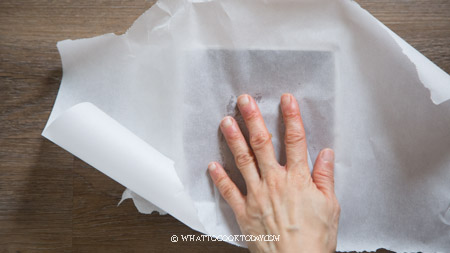 Use another piece of parchment paper to cover the top and use your palm to press the sticky rice down.