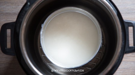 Place on top of a trivet. Pour in 1 cup of water in the inner pot of Instant Pot. Close the lid and turn the steam release valve to “sealing”.