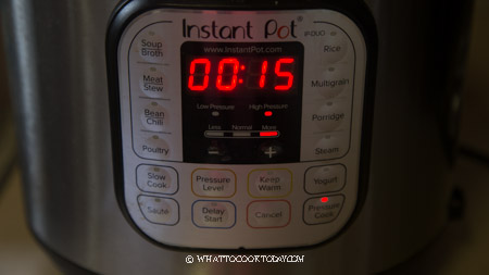 Press “pressure cook” and make sure it’s on high pressure. Set the timer to 15 minutes. I have a reader who cooked it for 4 minutes and it worked too.