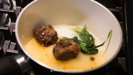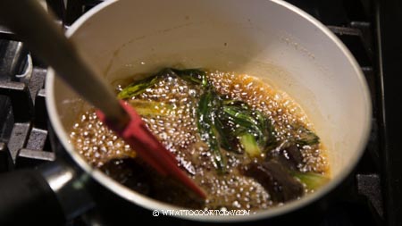 Strain the mixture to get rid of any impurities (if using palm sugar blocks). Discard the pandan leaves and pour it back into the saucepan.