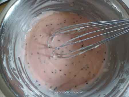 6. Add a few drops of red food coloring to the main batter. Add black sesame seeds to the red batter. I transfer the red batter into a measuring cup with a spout for easy pouring