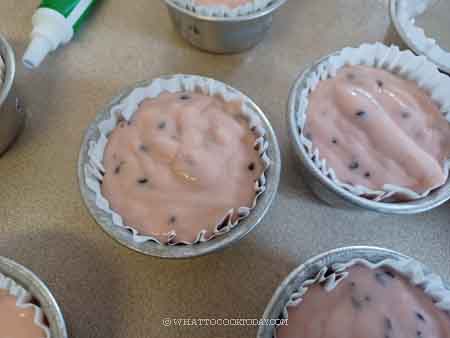 - Remove about 120 grams of the batter into a separate bowl. Add a few drops of green food coloring and a few drops of red food coloring to the main batter. Add black sesame seeds to the red batter. I transfer the red batter into a measuring cup with a spout for easy pouring
