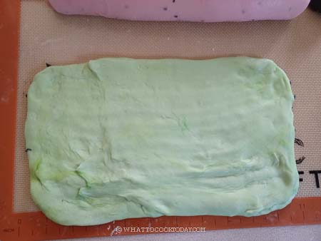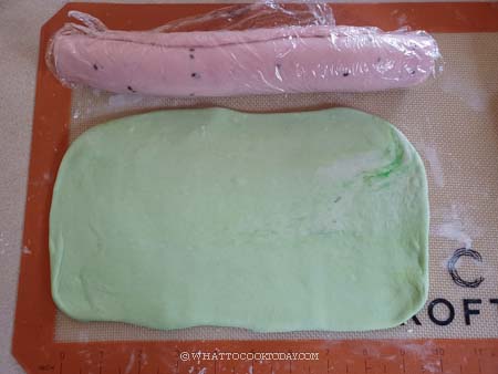 3. I put the 450 gr of the dough back into the standmixer, added few drops of natural food coloring (or red yeast rice powder if that’s what you are using) and black sesame seeds and continue to knead for about 5 minutes. I did the same thing for the green dough. I added about 1/2 tsp of pandan essence for the green color and knead it by hands into a dough since the amount is too small to be kneaded in the stand mixer. Knead until it is smooth. I added the charcoal powder to the small dough and knead until the color is even. Cover and let them rest for 15 minutes to relax the gluten