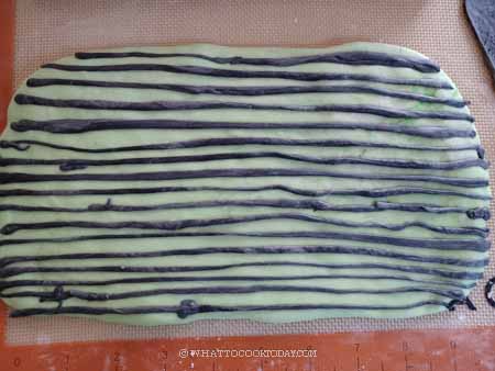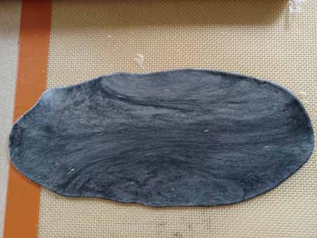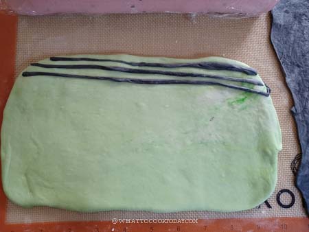 - Lightly dust your working surface and rolling pin with some flour. Roll the red dough out into about 10 x 6 inches rectangle. You can add more black sesame seeds if you don't think there are enough on the dough. Starting from the side near you, roll the dough up into a Swiss roll-like. Cover with a cling wrap