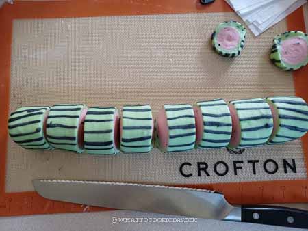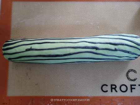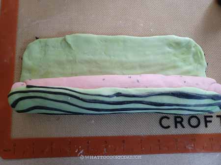 - Place these strips on top of the green dough. Gently flip the green dough over. Place the red dough on one of the long side near you. Roll the two doughs up together and then seal the green dough