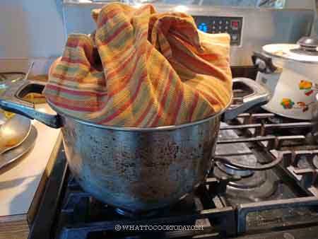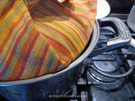 16. Wrap the lid with a cloth to prevent condensation from dripping on the buns. If you use a bamboo steamer, you don’t need to wrap the lid. Turn the stove to medium heat. When the water comes to simmer, this is when you start counting the time. Steam over medium heat for 12 minutes for large buns and 8-10 minutes for smaller buns. When they are done, let them cool inside the steamer for 1 minute and then gently open the lid to let the steam out and remove the buns to cooling rack to prevent the bottom from getting soggy