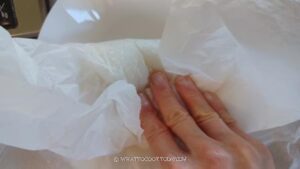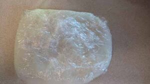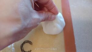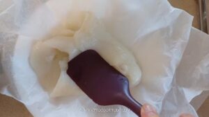 When it has cooled down and cool enough for you to handle, transfer to a working surface and wear a disposable plastic gloves if you have one so the dough won't stick to your hand. I use the parchment paper to help me knead at the beginning until it's not too hot and continue kneading the dough until the oil is absorbed by the dough and it is very smooth and stretchy.