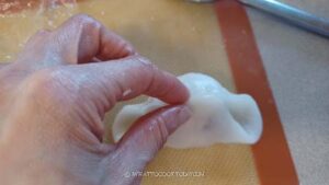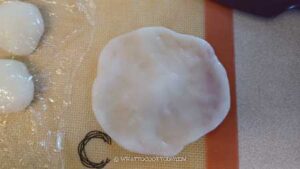 Work with one dough at a time, dust your work surface and your fingers with some toasted glutinous rice flour. Flatten the dough by stretching it with your fingers to form a round disc, about 3-4 inches in diameter