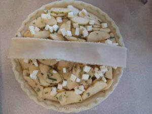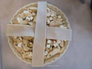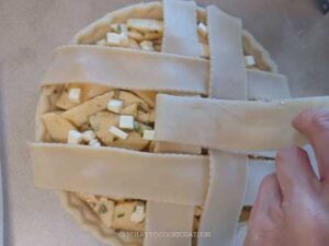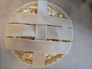 Cut one of the pie dough for the lattice into 6-8 strips, about 1 1/2-inch wide. They may not be the same length but that's okay