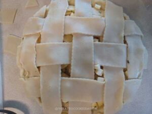 Prepare the pie crust using this all-butter pie crust. You will need two crusts, one for the pan and one for the lattice. The one for the lattice, you can skip fitting the dough into the pie pan