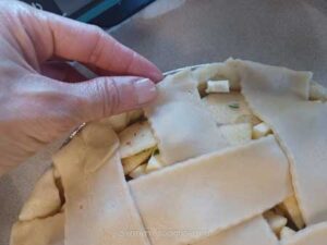 Tear or cut off the overhanging lattice pieces on the end so they are flush with the edge of the pie crust. Roll the edge of a pie crust in to seal the lattice.