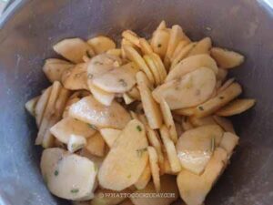 Peel and core the apples. Cut the apple into 1/4-inch thick slices. Combine sugar, rosemary, brown sugar, tapioca starch, nutmeg, and salt in a mixing bowl. Add apple slices and toss to combine