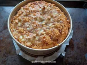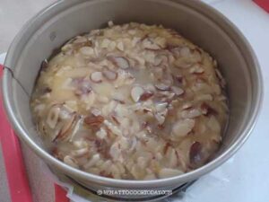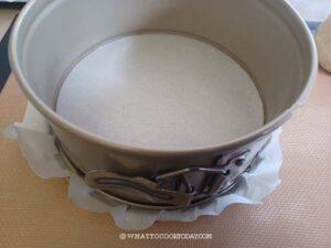 Use a 8 or 9-inch round pan. Line the bottom with parchment paper. Also cut a strip of parchment to line the side of the pan. If you use a springform pan, wrap the bottom outside with a foil to prevent the topping from leaking out during baking