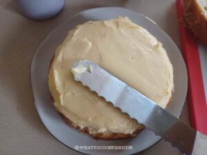 Give the chilled pastry cream a whisk to smooth things out before spreading on the cake. Use an offset spatula to spread the cream on the cake, leaving about 1/4 inch space around the edge and reserve some of the cream for touch up.