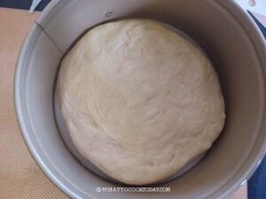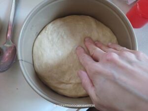 Place this large dough ball into the prepared baking pan, flatten the dough evenly with your palm to cover the base of the pan.