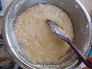 When they are about 80% mixed, add the blueberries and continue to fold the mixture. The batter is thick and lumpy. Stop mixing if you no longer see any more loose bits of flour.