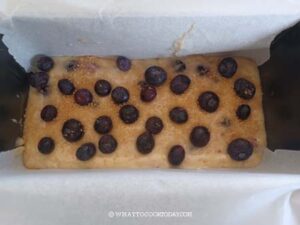 Scoop the batter into the loaf pan and use the rubber spatula to smooth the top. Tap the pan on the counter a few times to release any trapped air bubbles. Sprinkle with the rest of the blueberries and turbinado sugar evenly on top of the batter