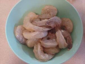 Place shrimp in a bowl. Add ½ tsp baking soda + ½ tsp salt, toss well. Let sit 15–20 minutes. Rinse shrimp thoroughly under cold water, then pat very dry.