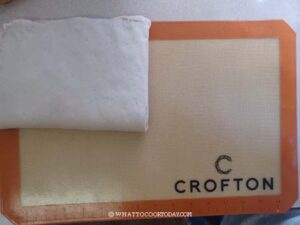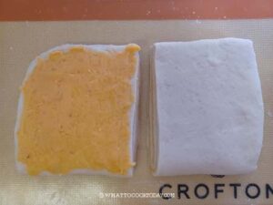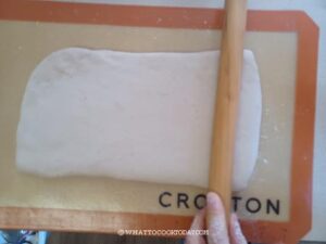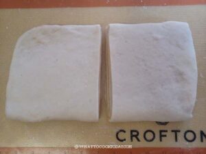 Lightly dust your work surface with a bit of flour if necessary. Use a rolling pin to roll the dough out into about 10 x 15 inches (25.5 x 38 cm) rectangle. Don't have to be exact. Use a bench scraper to cut halfway in the middle of dough