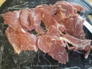 I use a boneless pork butt/pork shoulder. Trim off any excess fat. I suggest to cut it into 2 to 3 strips. Then I put these strips in the freezer for about 1 hour to partially freeze them so they can be easily cut into thin slices