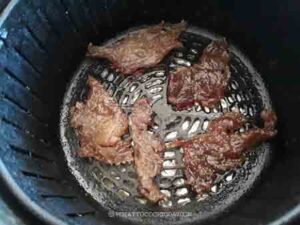 Preheat your air fryer to 350 F (180 C). Spray your air fryer basket with cooking spray or brush with some oil. Brush oil on both sides of the pork slices and then arrange them in one layer on the basket. Do not overcrowd the basket. Do this in batches. Air fry for 3-5 minutes (the time varies depending on your air fryer model, so you need to monitor) until they are nicely brown but not burned
