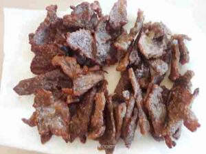 This recipe roughly yields about 300-350 grams (11-12 oz) of dendeng babi manis