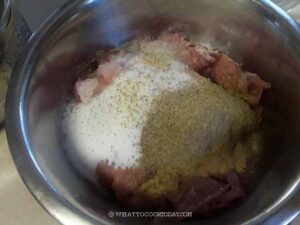 Add sugar, ground coriander, salt, and garlic powder. If you want to add the optional chili powder and red yeast rice powder, this is when you add them too.